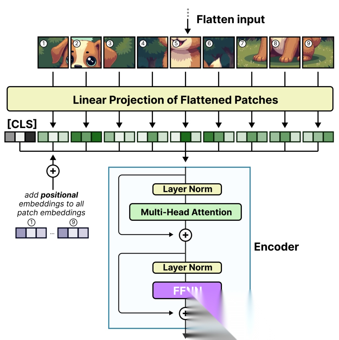 这些 patch(或 token)会被映射为 embedding(并加上额外的位置 embedding),然后送编码器中,ViT 的基础架构如下,其中 FFNN 层可直接替换为 MoE 层: