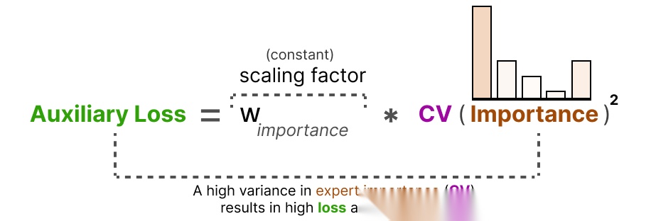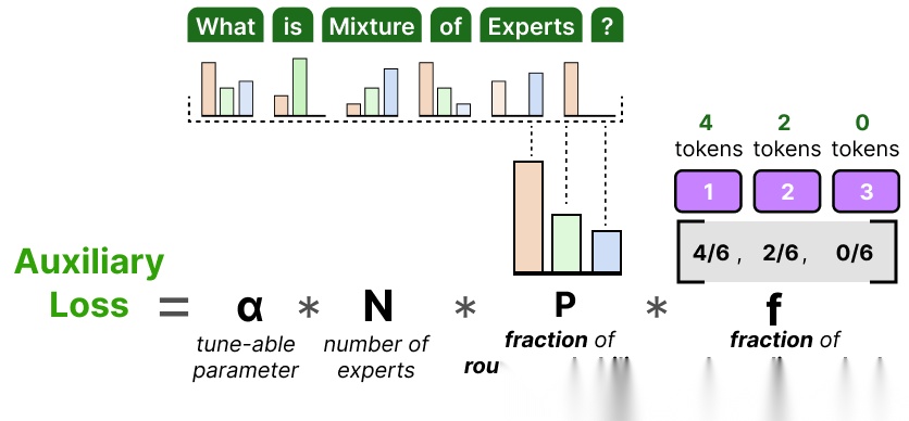 仅靠策略调整难以完全解决负载均衡问题,因此研究者在主损失(如交叉熵损失)之外,引入 “辅助损失(Auxiliary Loss)”,将 “专家使用均匀性” (各个专家模块被激活的频率是否均衡。它衡量的是:模型是否公平地利用了所有专家,而不是偏向某几个专家。)纳入模型优化目标