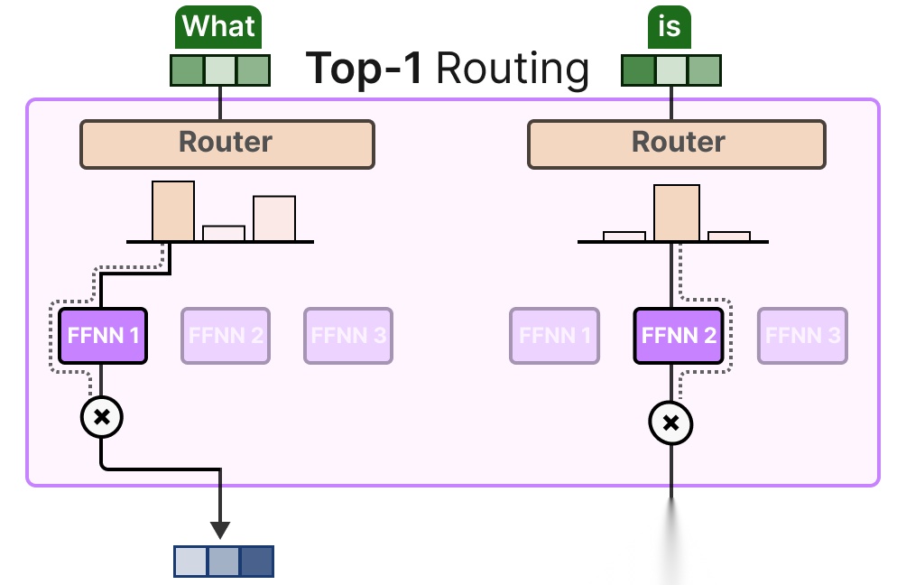 - Top-1 路由:每个 token 仅分配给 1 个专家(如 Switch Transformer),计算成本最低,但可能丢失多专家协同的优势;