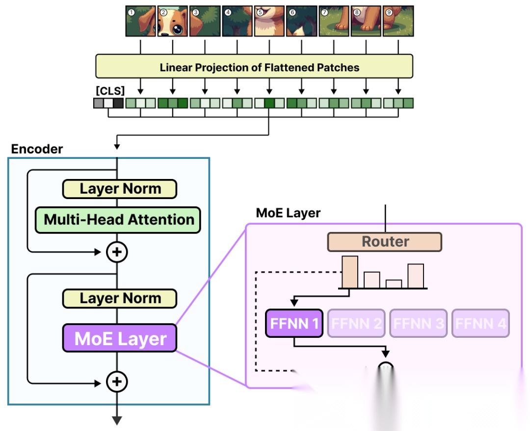 V-MoE 的架构与 ViT 一致,仅将编码器中的 FFNN 层替换为 “路由器 + 多个专家” 的 MoE 层: