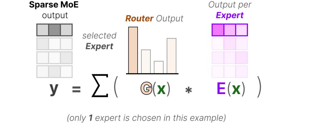 根据概率分布,选择概率最高的 Top-k 个专家(稀疏 MoE),每个选中专家的输出会乘以对应的概率,最终加权求和得到该 token 在 MoE 层的输出: