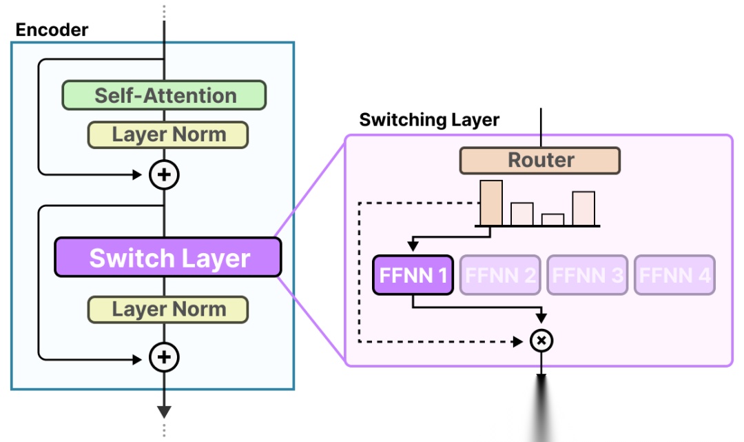 路由器 + 一组专家(通常为 4~8 个)构成一个完整的 MoE 层(图中Switch Layer),其在 Transformer 架构中的融入方式如下: