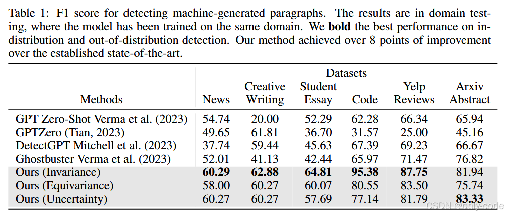 接下来是更苛刻的 out-of-distribution 场景:在一个数据集上训练,在另一个数据集上测试。这里作者主要跟 Ghostbuster 对比: