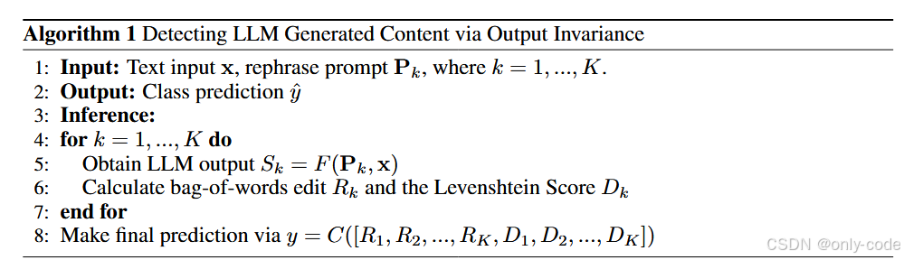 【插图:论文 Algorithm 1「Detecting LLM Generated Content via Output Invariance」伪代码】