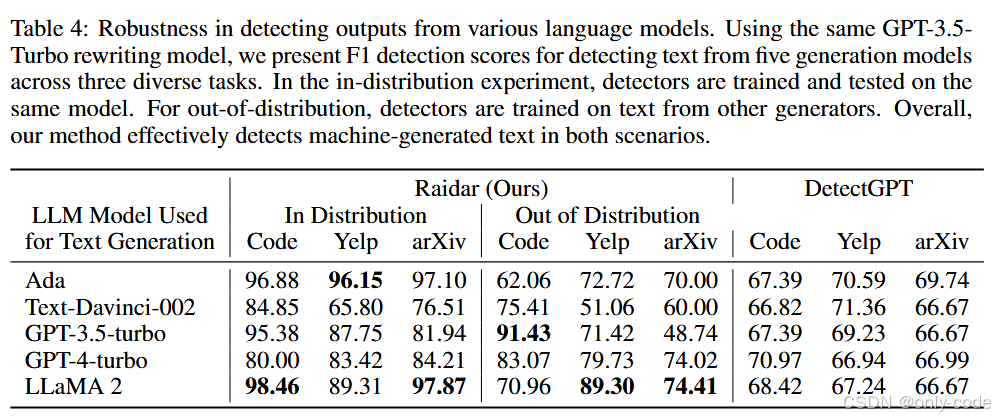 - 在 arXiv 摘要 上,RAIDAR 不变性 F1 为 81.94,Ghostbuster 为 76.82;