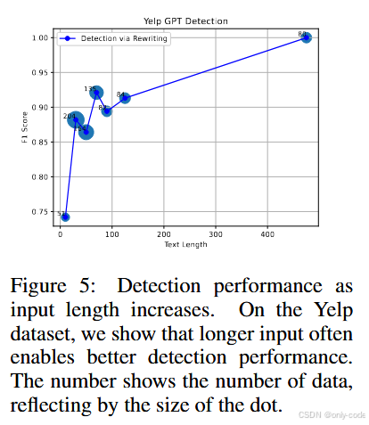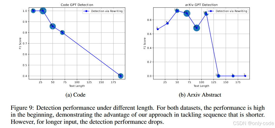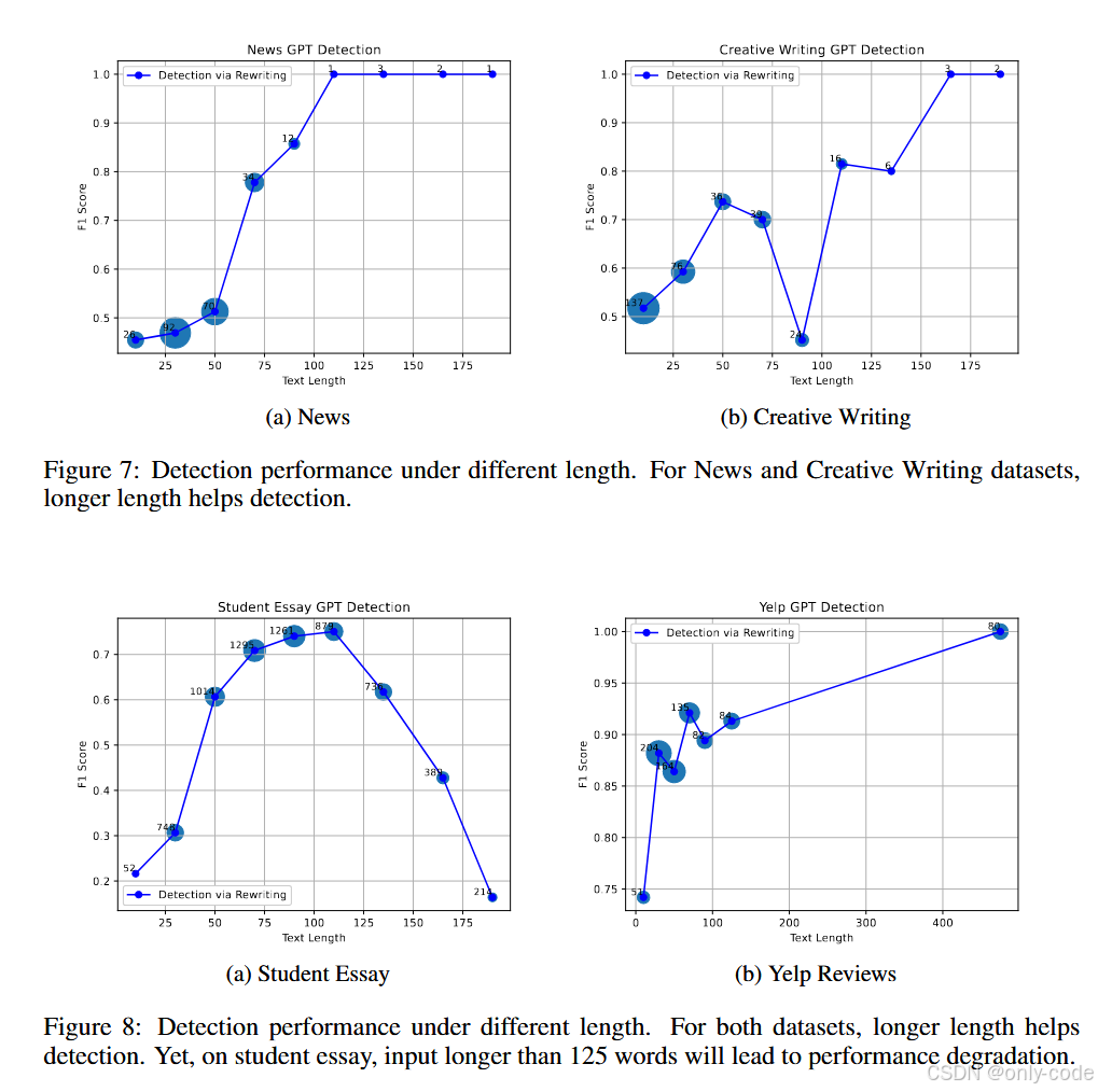- 在学生作文、代码等数据集上,长度过长时反而会有一点性能下降,比如学生作文超过 125 词后,F1 会从峰值往下掉。这可能和训练数据、重写器的行为模式有关:太长的输入会让模型倾向于做更局部的修改,从而拉近人类和 GPT 文本的“重写幅度”。