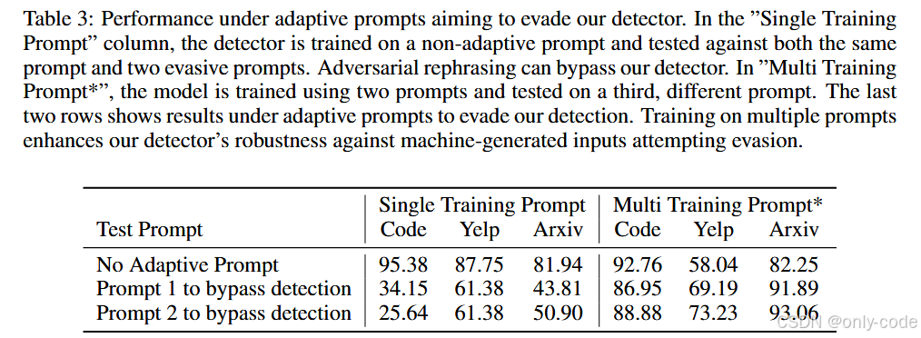 在只用单一训练 prompt 的情况下,这种对抗性生成确实能严重拉低检测效果,例如在代码数据集上 F1 直接掉到 25–34。但当作者在训练阶段使用多种 prompt 混合训练,再对完全没见过的新对抗 prompt 进行测试时,F1 又能拉回到: