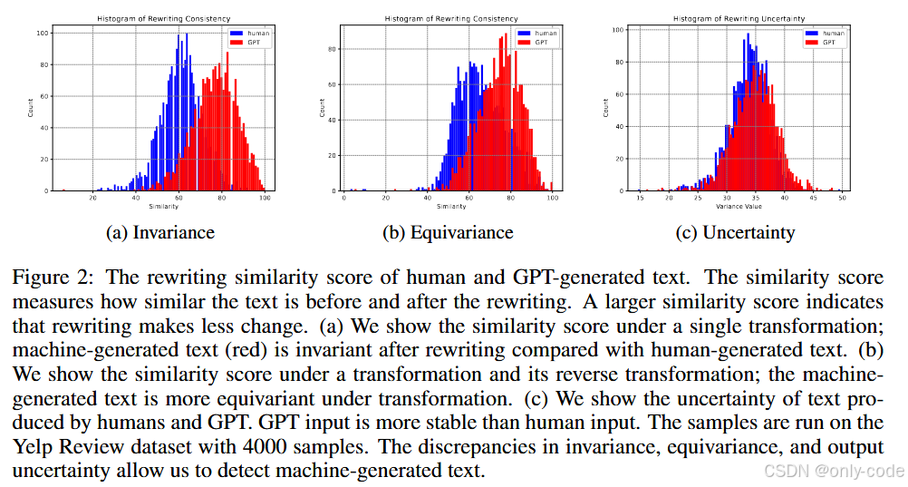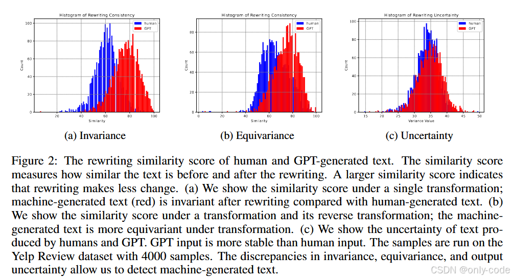 思路是:如果一段输入在模型空间里“位置很稳”,那每次重写都会在一个很小的局部附近晃动,互相之间改动不大;反之,如果模型对这段文本“不太有把握”,多次重写就会跑出很多不同版本。 Figure 2(c) 的直方图显示,GPT 文本的重写结果更集中,人类文本更发散。