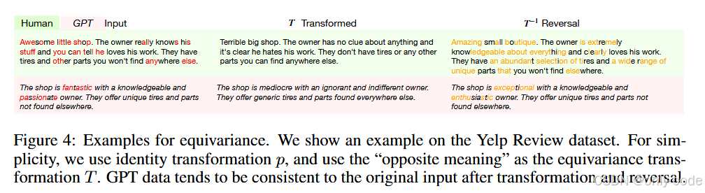 【插图:论文 Figure 4,等变性示例(Yelp Review,反义变换与逆变换)】
