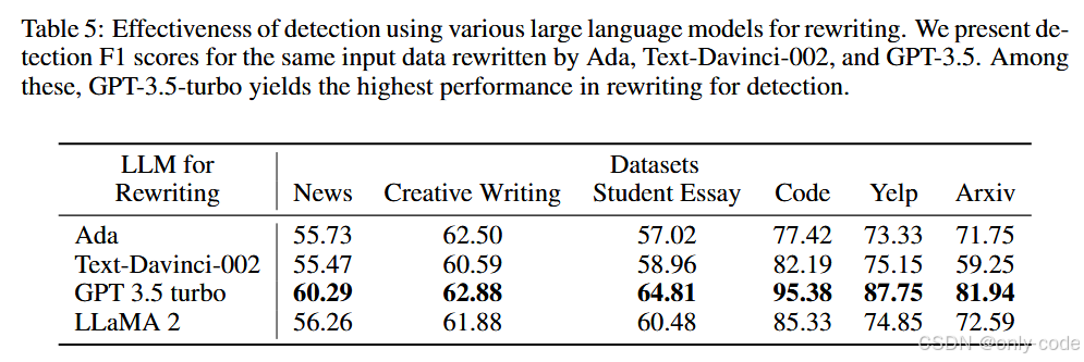 重写这一步一定要用 GPT-3.5 吗?作者试了几种替代方案:Ada、Text-Davinci-002、GPT-3.5-Turbo、LLaMA2。结果很清楚: