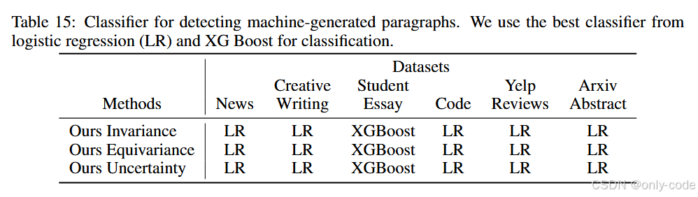 作者把这些特征丢进一个简单的分类器 (C):在大多数数据集上用 Logistic Regression,在学生作文数据集上发现 XGBoost 表现更好。表 15 列出了每种特征在各个数据集上对应的最佳分类器选择。