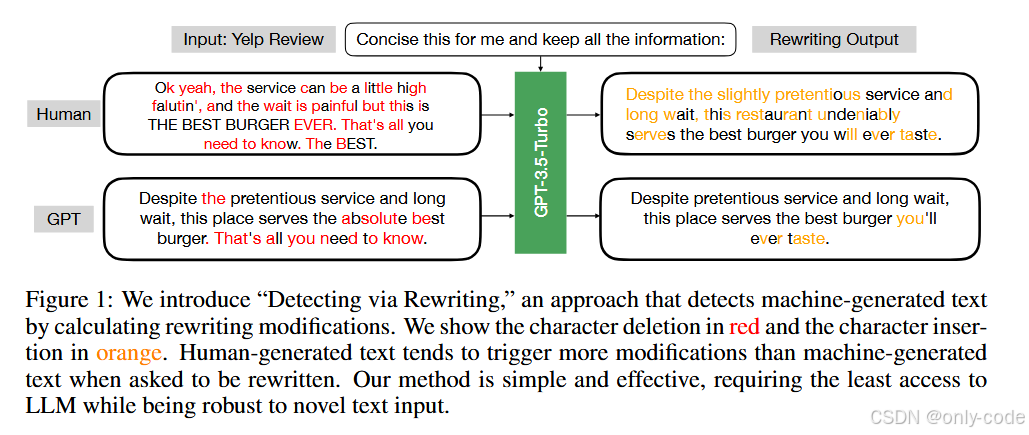 在 Figure 1 中,作者把一段 Yelp 评论交给 GPT-3.5-Turbo:「帮我简洁地改写」。对人类写的评论,模型会大量合并、删减、替换表述;对 GPT 写的评论,改动就明显小得多。图中用红色标注删除的字符、橙色标注插入的字符,一眼就能看出改写幅度的差异。