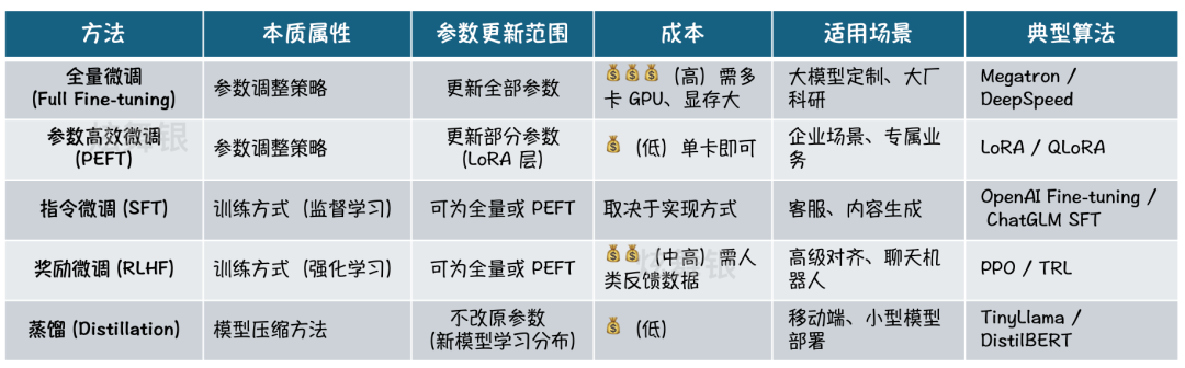 微调并不止一种。根据算力、场景、预算不同,可以分为以下几类: