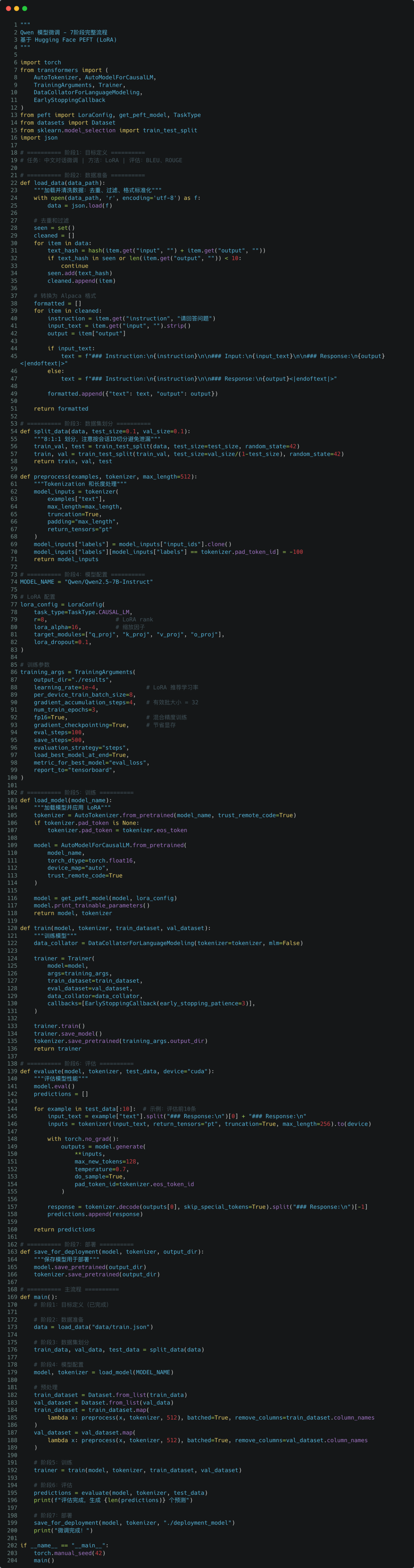 在本节,我将以 Qwen2.5-7B-Instruct + Hugging Face PEFT 为例,展示一套从目标定义、数据准备、模型训练到部署上线的完整工程化流程。本节旨在演示整体步骤与关键逻辑,代码片段经过简化以便阅读。