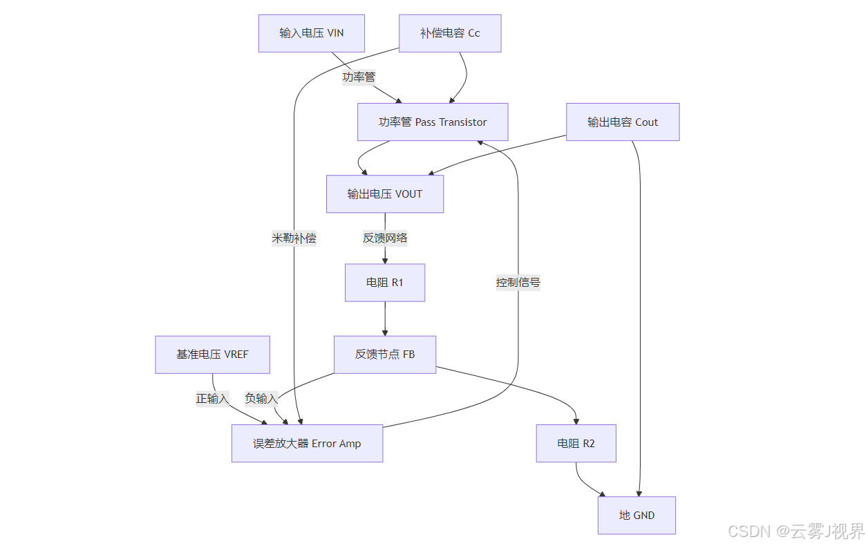 LDO采用电压-电压负反馈架构(图1),由误差放大器(EA)、功率管(Pass Transistor)、反馈网络(R1/R2)和补偿电容(CC)组成。其闭环增益为: