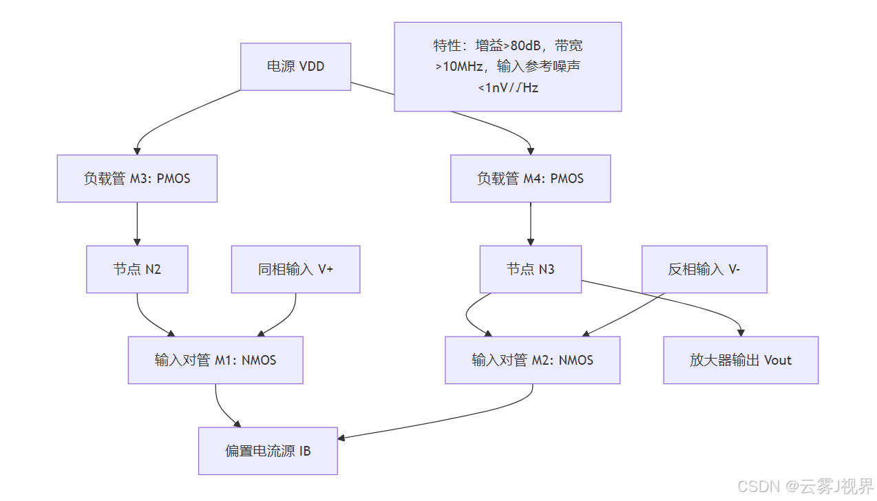 采用折叠共源共栅架构(图3),输入对管M1/M2选用NMOS(),负载管M3/M4为PMOS电流源,提供高增益(>80dB)和宽带宽(>10MHz)。关键参数: