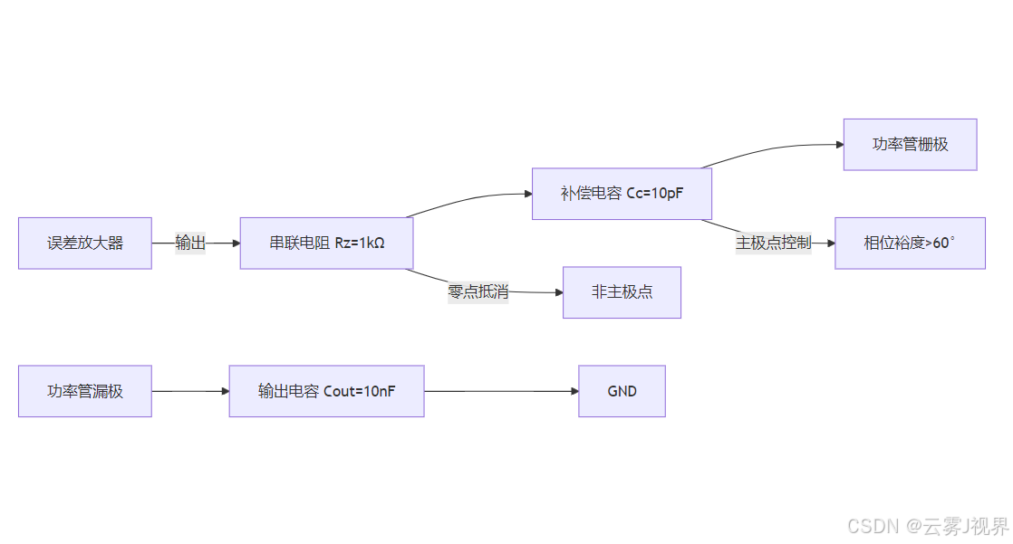 LDO的稳定性由环路相位裕度(PM)保证,需满足PM>60°。采用米勒补偿(图2),在误差放大器输出与功率管栅极间接入补偿电容C_C,引入主极点,同时通过零点抵消非主极点: