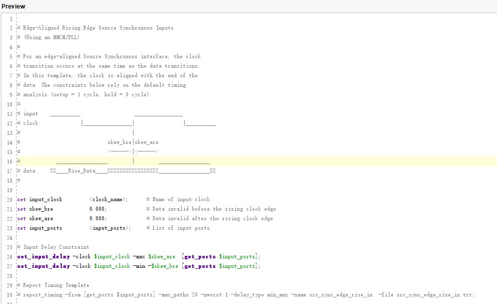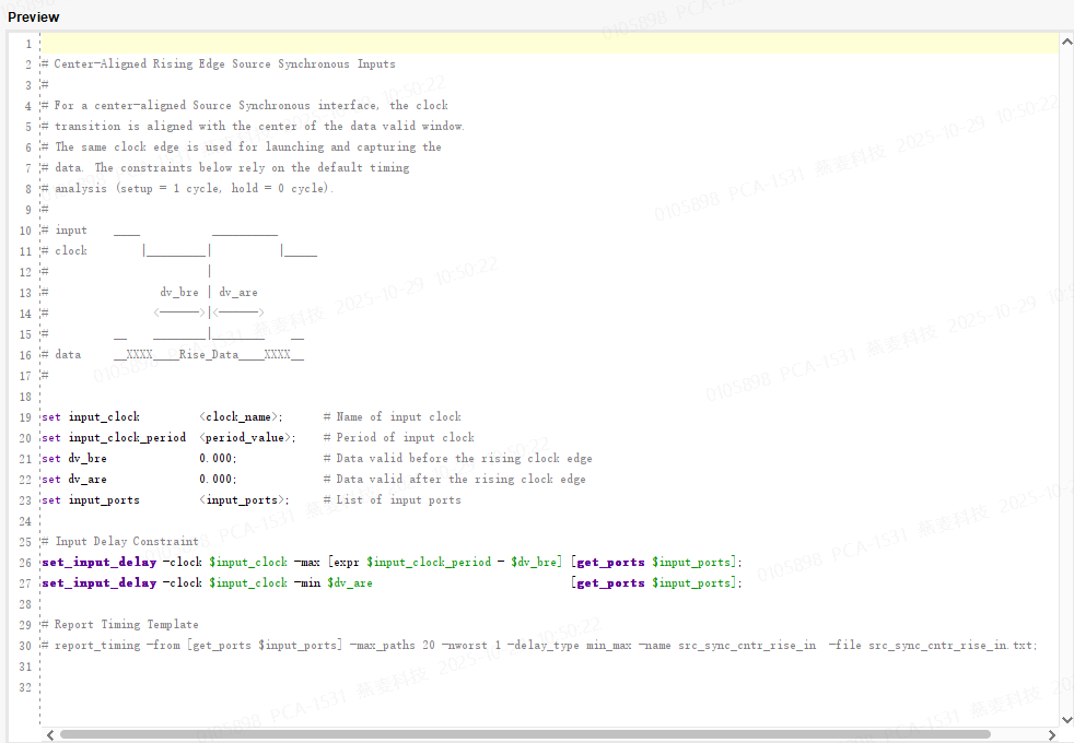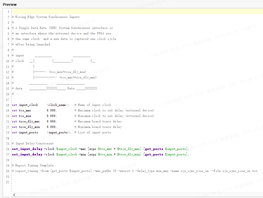 先从Vivado自带的约束语句开始学习在Language Template>XDC>Timing Constraints>Input Delay Constraints>Source Synchronous意义:-max:上一个参考沿之后,最大能延迟输出新数据的时间-min:在参考沿之后,最小需要延迟的时间。