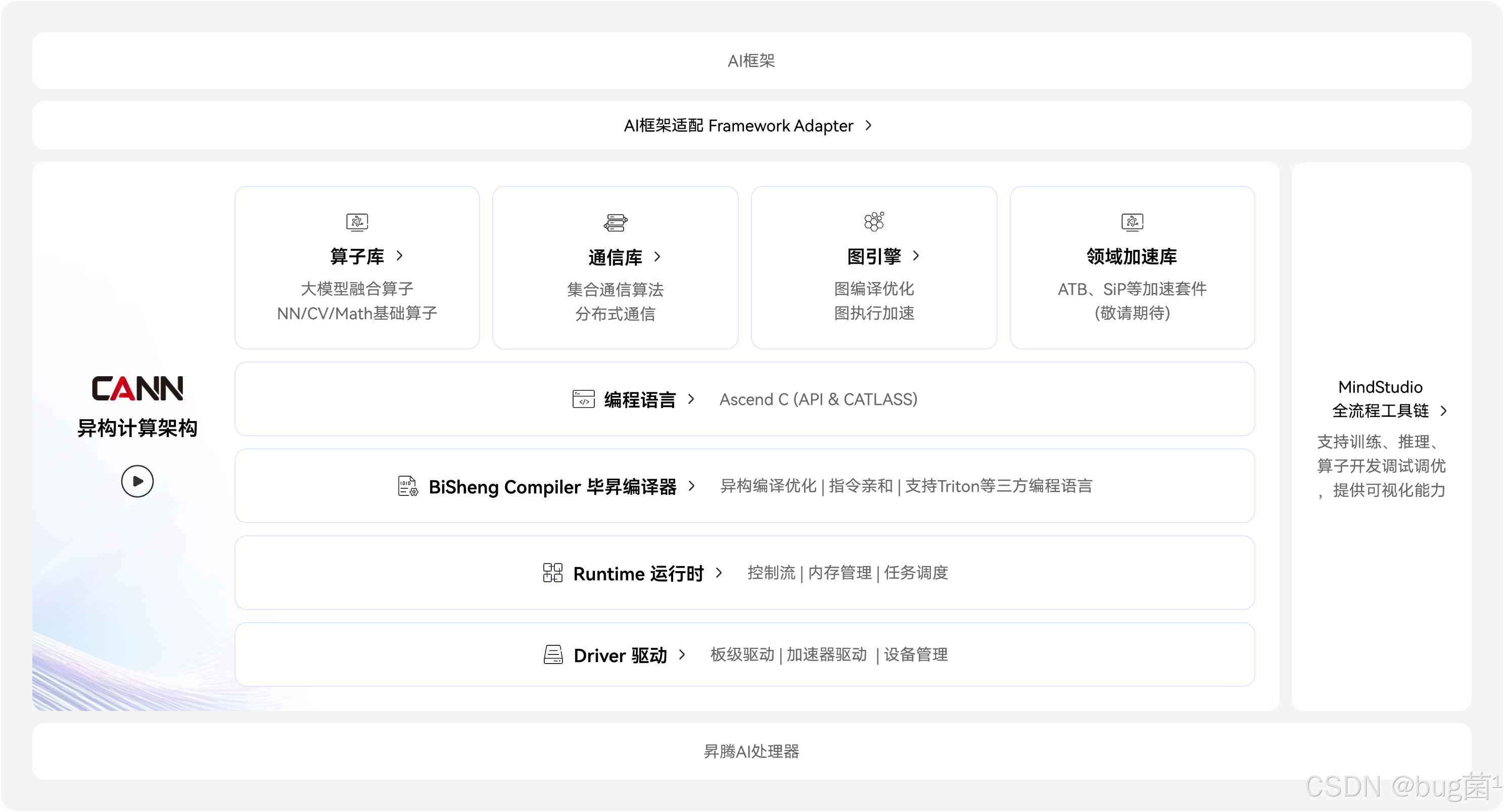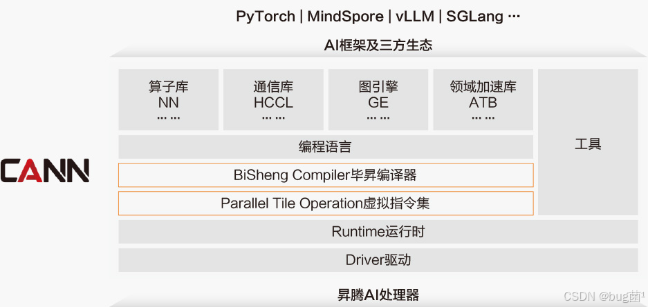 CANN架构提供了从上到下的完整工具链,包括上层的AI框架(如PyTorch, TensorFlow)、中间层的AscendIR(图层IR)、底层的算子库(OPP)和TBE(算子开发工具)。