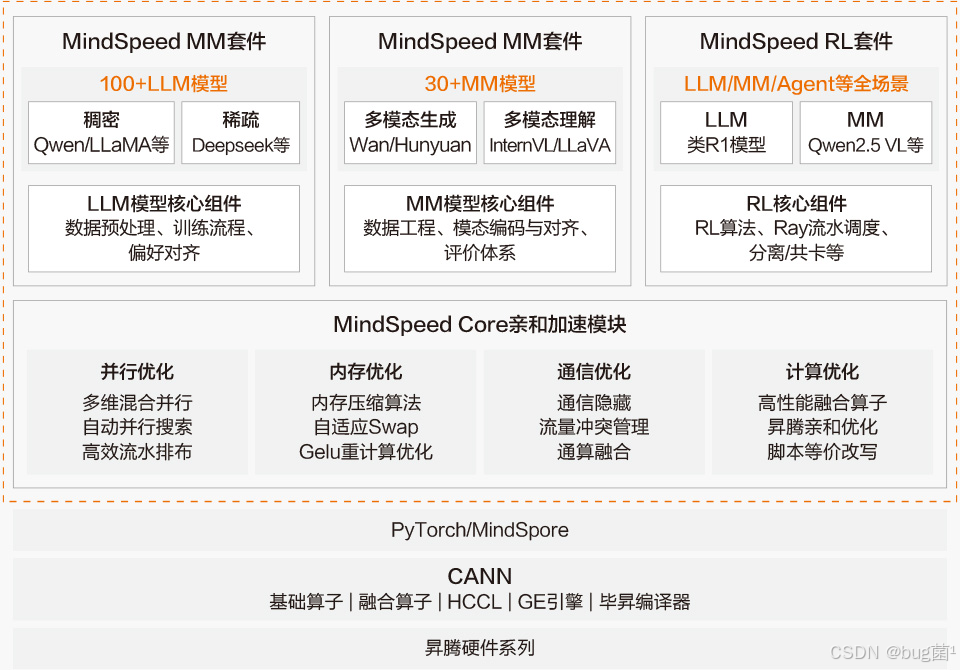 然后,针对昇腾AI为大模型分布式训练,有专门开凿加速库MindSpeed,如下是MindSpeed架构图: