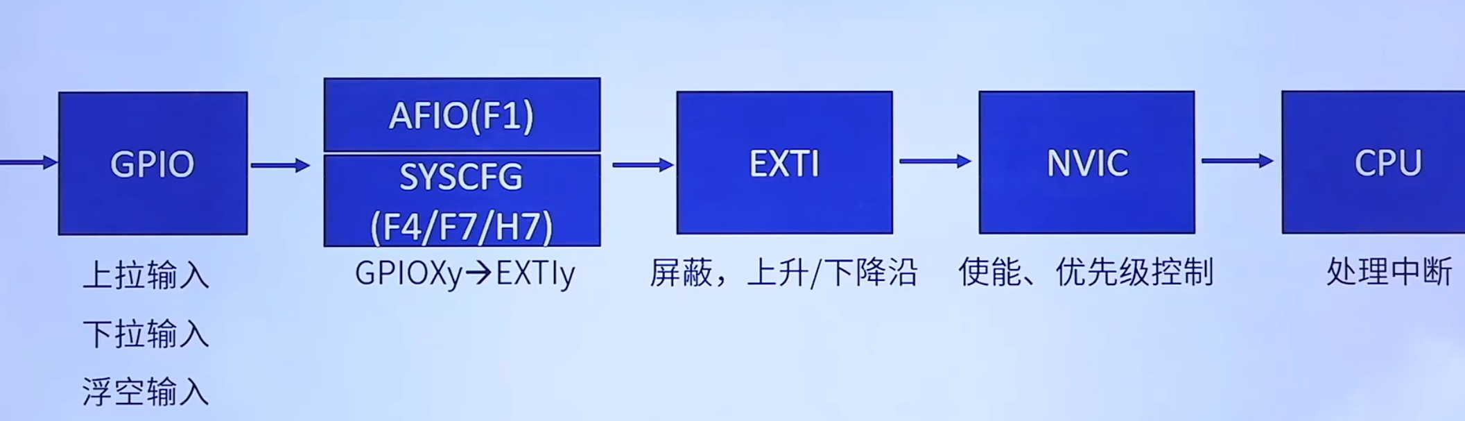 .1使能GPIO时钟,.2设置gpio输入模式,.3使能afio时钟,.4设置exti和io对应关系,.5设置exti屏蔽,上/下沿,.6设置nvic,设置中断服务函数。步骤2~5可用HAL_GPIO_Init一步到位
