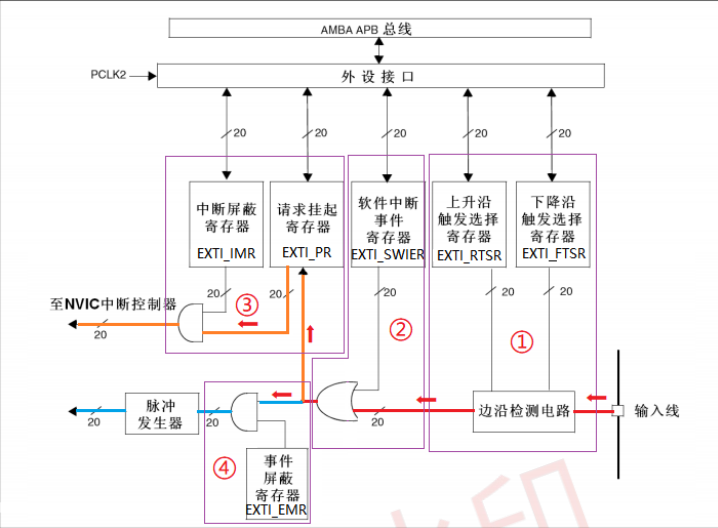 ①边沿检测,②软件触发,③中断屏蔽/清除,④事件屏蔽
