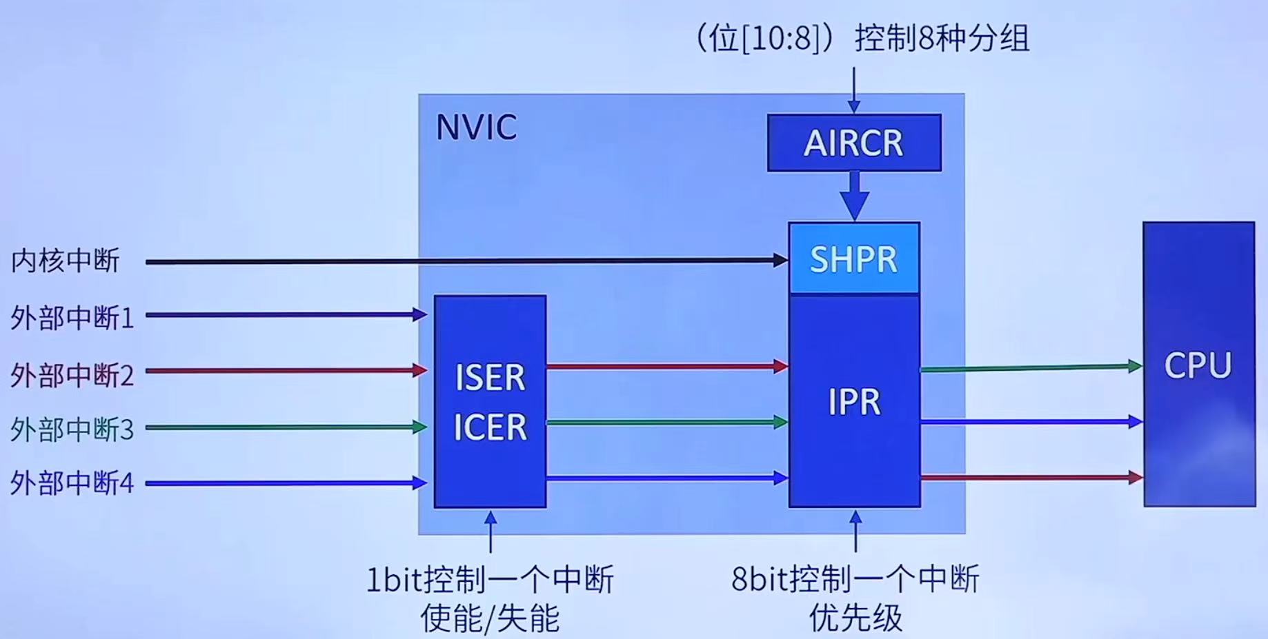 NVIC的配置步骤1,设置中断分组(AIRCR);2,设置中断优先级(IPR);3,使能中断(ISER)