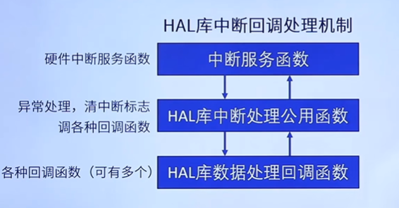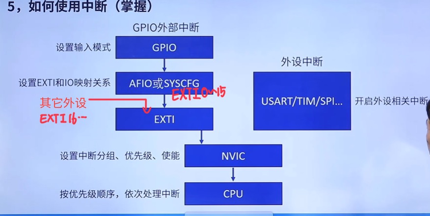 .1使能GPIO时钟,.2gpio/afio/exti(HAL_GPIO_Init),.3设置中断分组,.4设置中断优先级,.5使能中断,.6设置中断服务函数,清中断标志,exti0~4各有一个中断服务函数,exti9-5用一个,exti15-10用一个,stm32共七个外部中断服务函数
