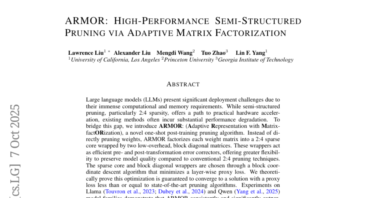 A:ARMOR是一种新型的AI模型压缩技术,全称是"自适应矩阵分解表示"。它主要解决了现有2:4稀疏化方法压缩模型后性能严重下降的问题。传统方法直接删除模型参数,而ARMOR通过巧妙的矩阵重组,既保持了硬件加速优势,又大幅减少了性能损失。