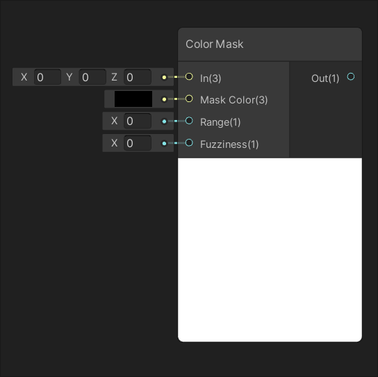 根据输入 In 中的等于输入 Mask Color 的值创建遮罩。输入 Range 可用于在输入 Mask Color 周围定义更宽范围的值以便创建遮罩。此范围内的颜色将返回 1,否则节点将返回 0。输入 Fuzziness 可用于软化选择范围周围的边缘,类似于抗锯齿效果。