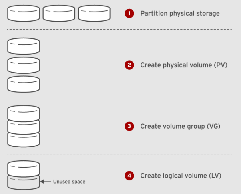 - 逻辑卷(LV, Logical Volume),是从卷组中创建出来的一个逻辑空间。如果把一个卷组类比为一个逻辑硬盘,那么逻辑卷则可以类比为一个硬盘分区,所以也可以在逻辑卷之上创建文件系统。