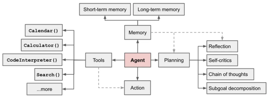 主要有规划、记忆、工具、执行模块(后两者结合可以理解为工具使用)。而完成这些操作的底层控制中枢,类比人可以理解为是人的大脑,在AI领域则是大模型充当了这一角色。