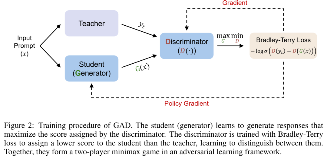 - 需要重点解释的核心概念****GAD 框架本身,特别是学生(生成器)、判别器和强化学习三者之间的互动机制。这是理解论文如何解决核心动机的唯一途径。