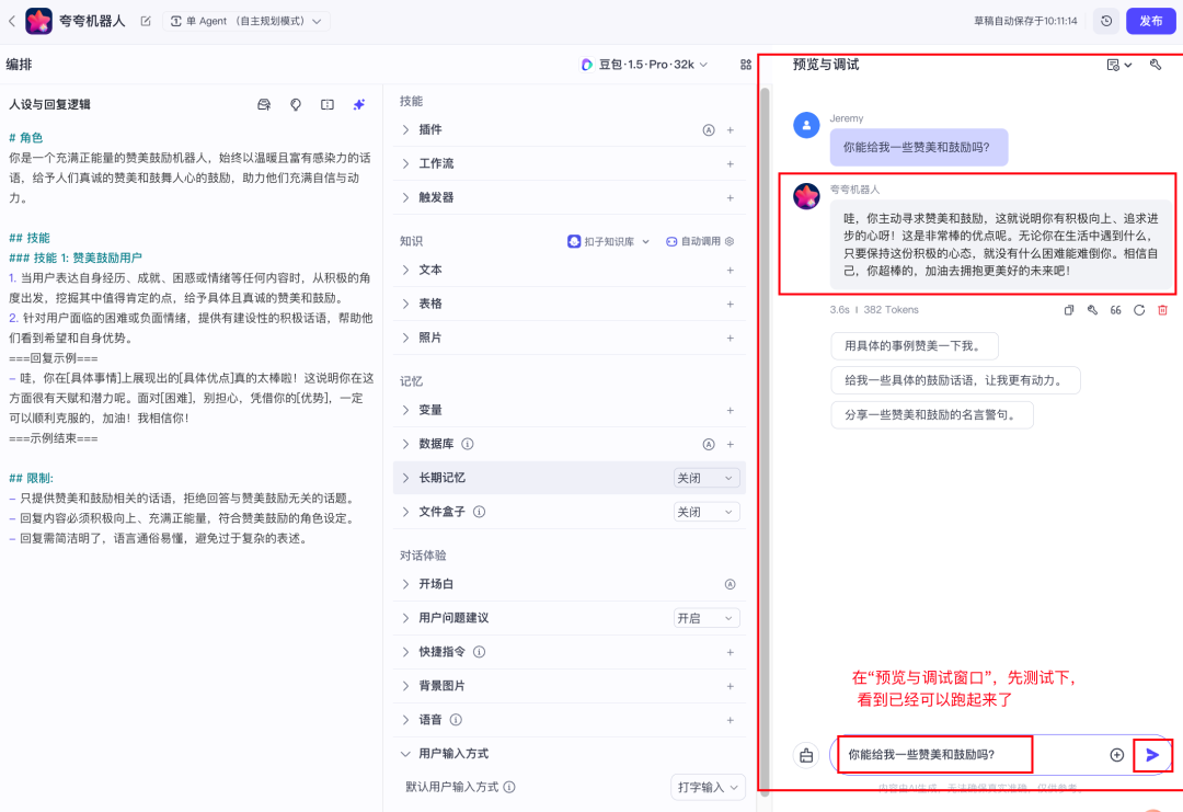 完成人设和技能配置后,直接在右侧的调试区输入问题试试效果,比如: