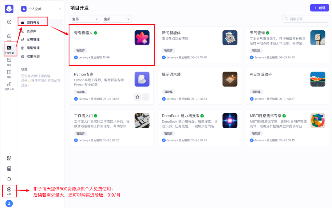 此外,在扣子“右侧工具栏”,“工作空间”中的“项目开发”,可查阅自己所创建的所有智能体!