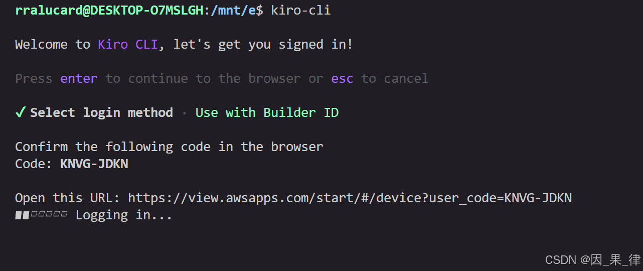 只需点击 URL 并使用 Builder ID 登录,即可完成全部认证流程。