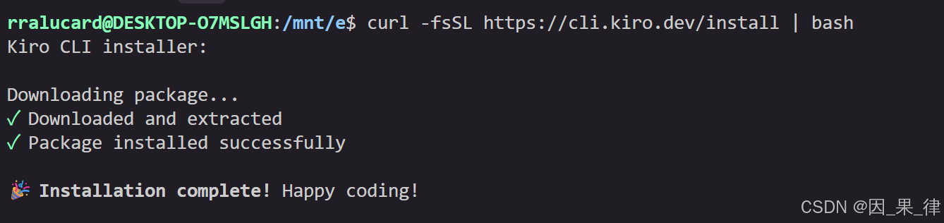 一旦 WSL2 环境就绪,即可安装 Kiro CLI。