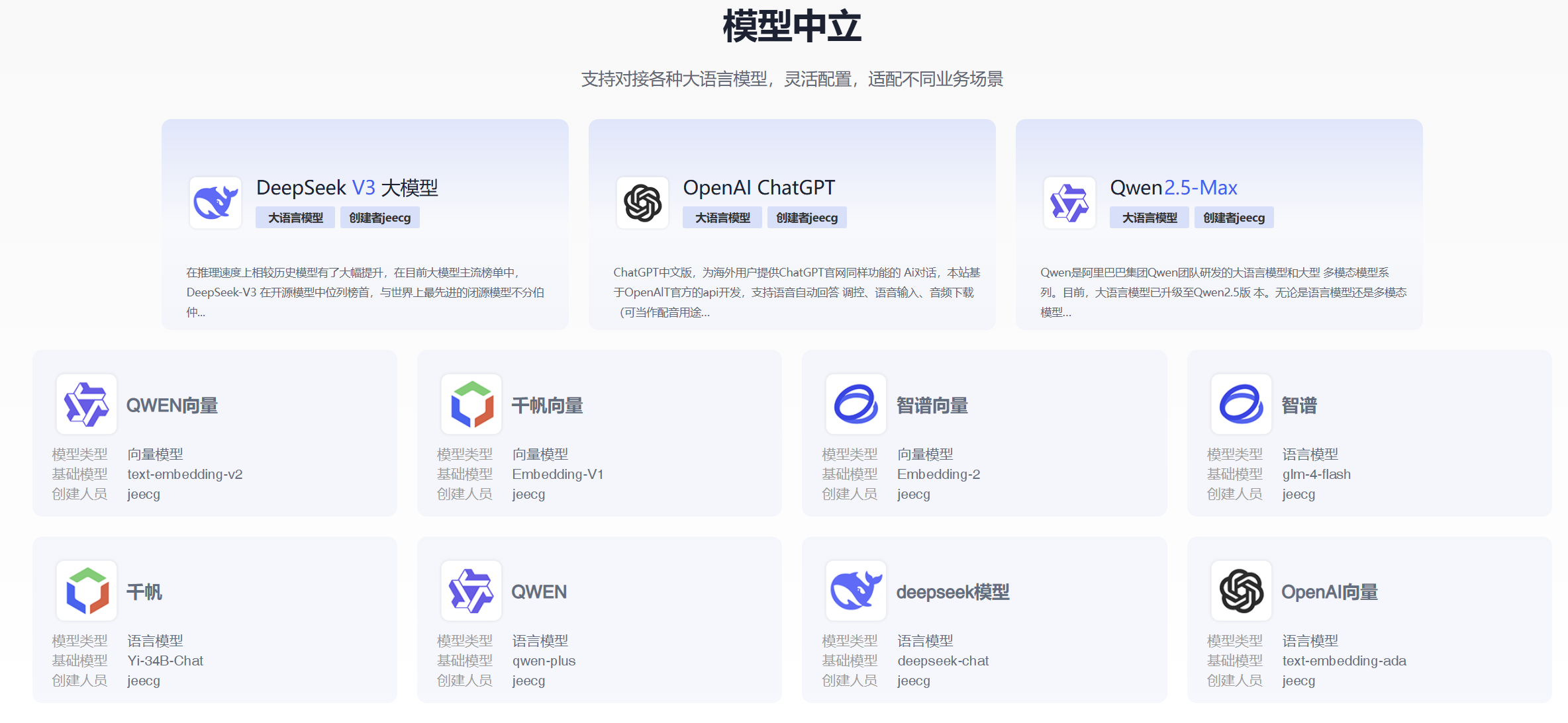 两者均支持多种大语言模型的接入与管理。JEECG AI支持包括本地私有模型(Deepseek、Llama 3、Qwen 2等)、国内主流大模型(通义千问、腾讯混元、智谱AI等)以及国际模型(OpenAI、Claude、Gemini等),提供了更丰富的模型生态选择。