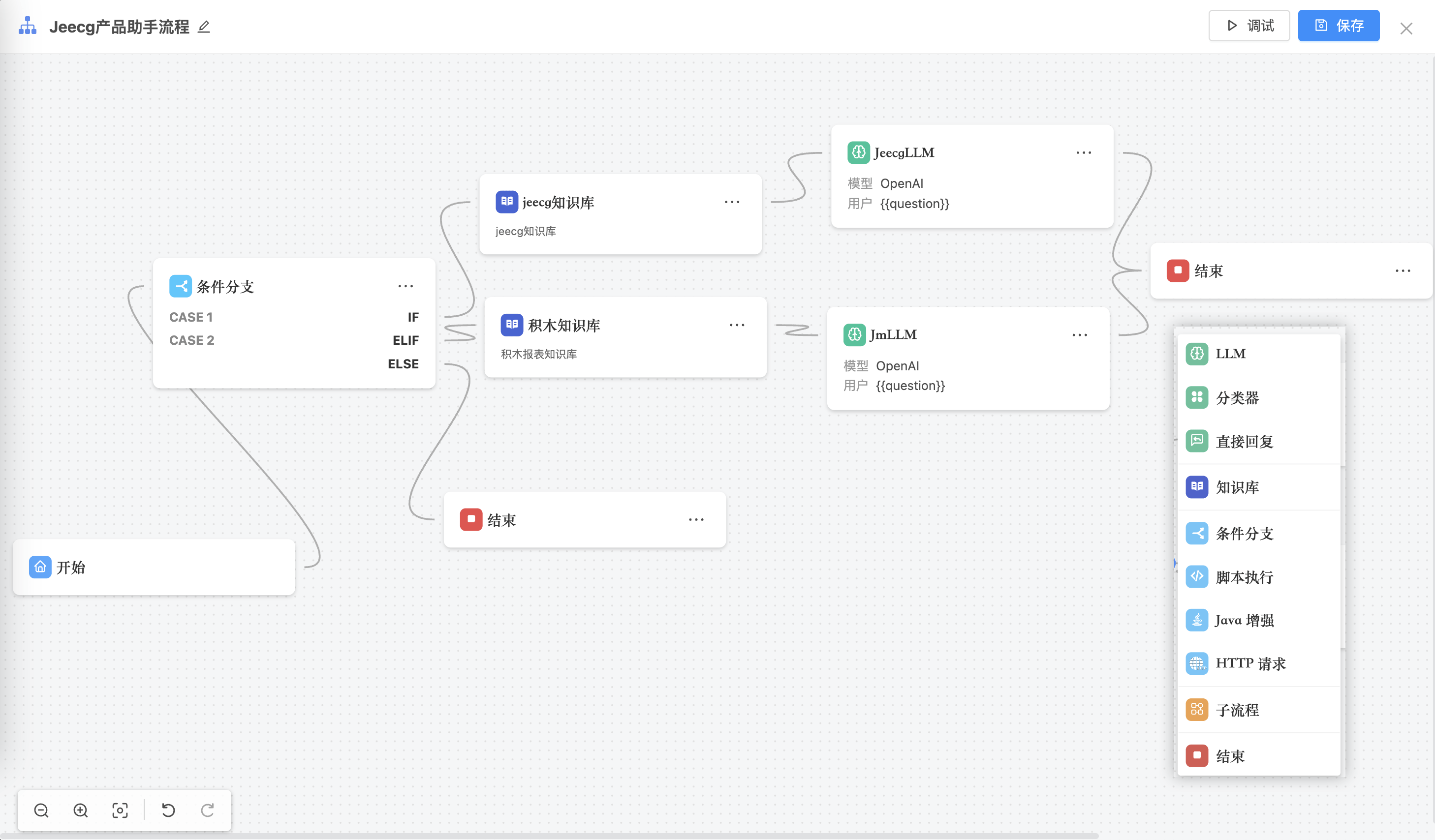 JEECG AI内置强大的AI流程设计器,支持低代码拖拽式流程编排,用户可以轻松构建复杂的AI业务流程,如自动翻译、接口格式转换、智能客服机器人、自动化文件处理等。其流程运行状态实时可视,便于调试和优化。