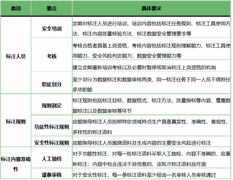 个人信息保护方面,要求服务提供者应确保其个人信息处理行为具有合法性基础,即取得对应个人信息主体的同意或符合法律、行政法规规定的其他情形。当涉及敏感个人信息的使用时,还必须获得个人的单独同意。 - 语料标注安全