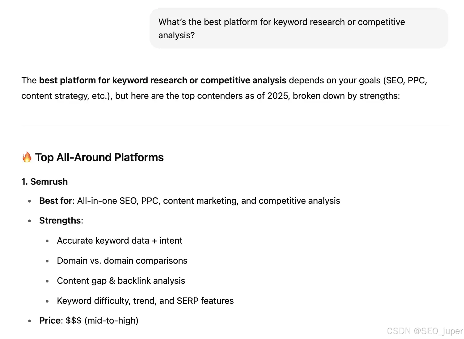 例如,当我询问最佳关键词研究或竞争分析平台时,ChatGPT将Semrush列为首选推荐。这意味着它能引导我们的目标受众直接访问网站注册服务。