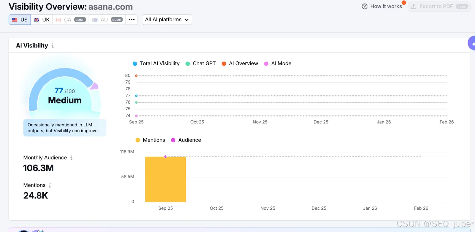 您将看到反映品牌被引用频率的AI可见度评分(0-100分),以及"提及量"和"月度受众"等指标来评估覆盖范围。