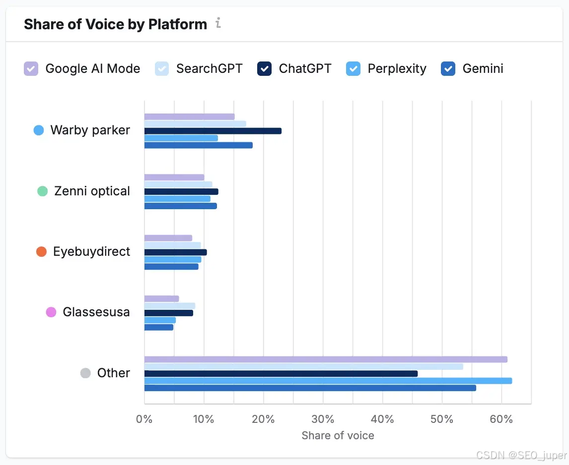 "可见度"报告将展示您的品牌声量份额——该指标反映了您的品牌在AI生成的答案中相对于竞争对手的出现频率。