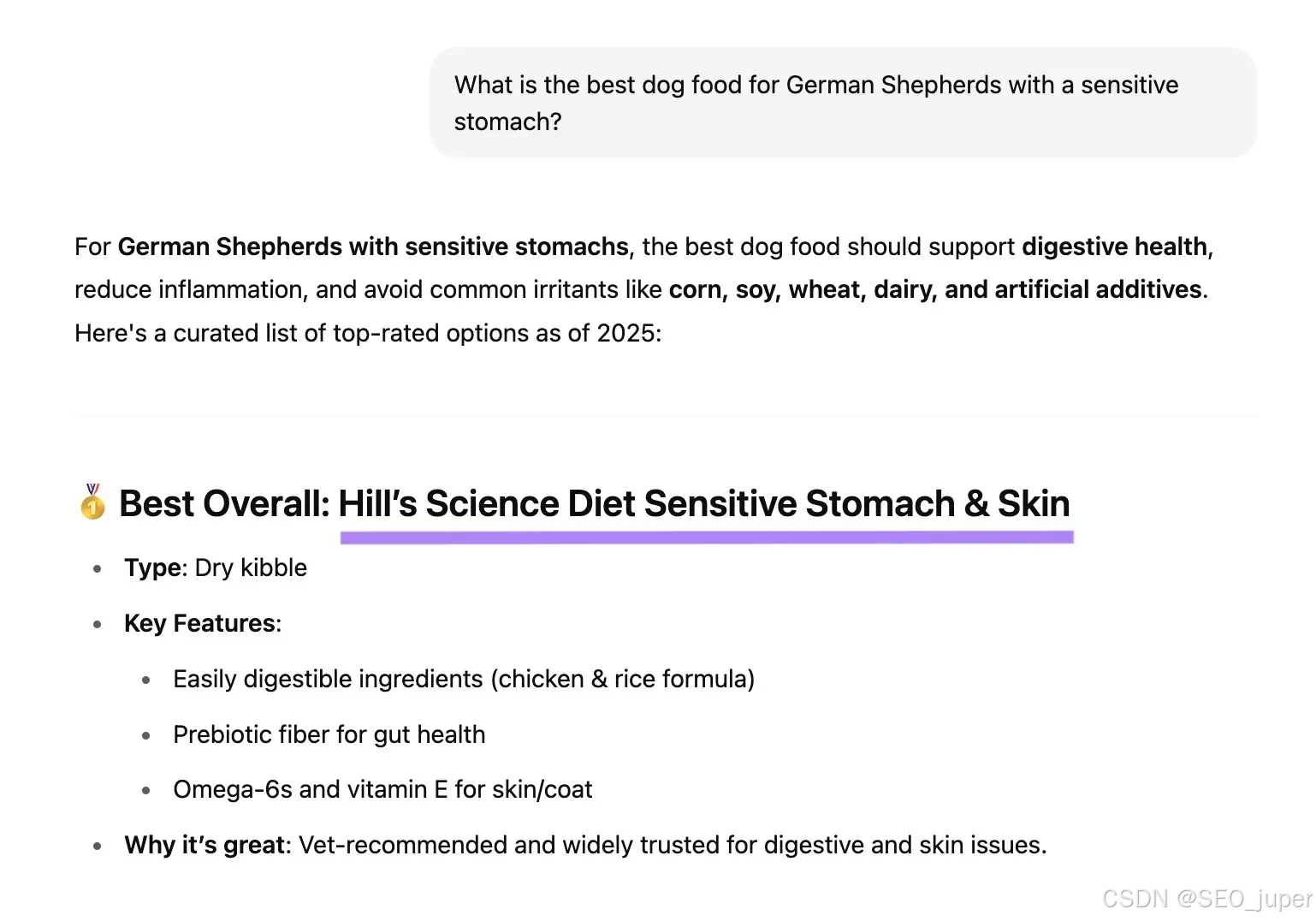 例如某狗粮品牌可提问:“哪种狗粮最适合肠胃敏感的德国牧羊犬?”