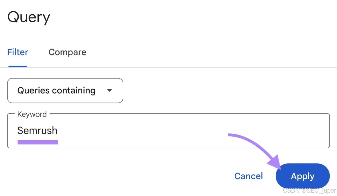 请确保选中“包含以下查询”选项,并准确输入品牌名称(与实际拼写完全一致)。例如,Semrush应在“包含以下查询”字段中输入“Semrush”。