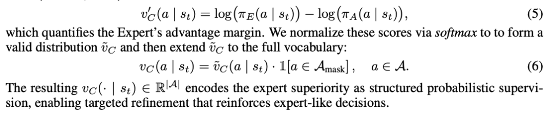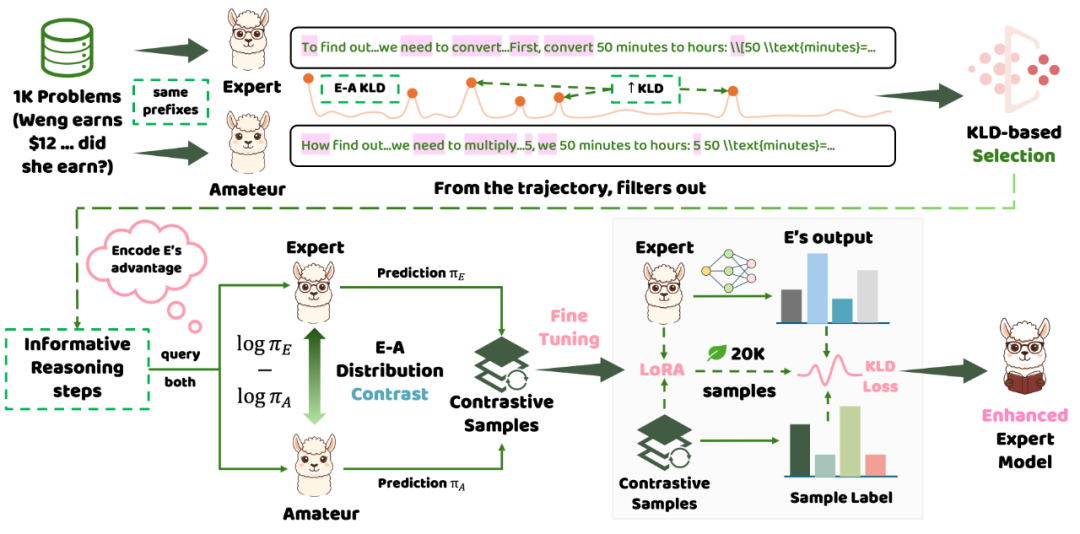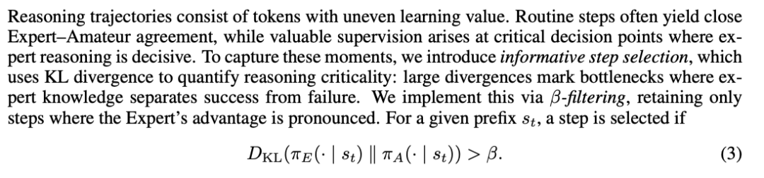 - 信息性步骤选择:使用阈值过滤器自动定位关键步骤。实现的方法是:仅当专家与业余模型的输出分布之间的KL散度超过阈值β时,该步骤才被保留用于训练。