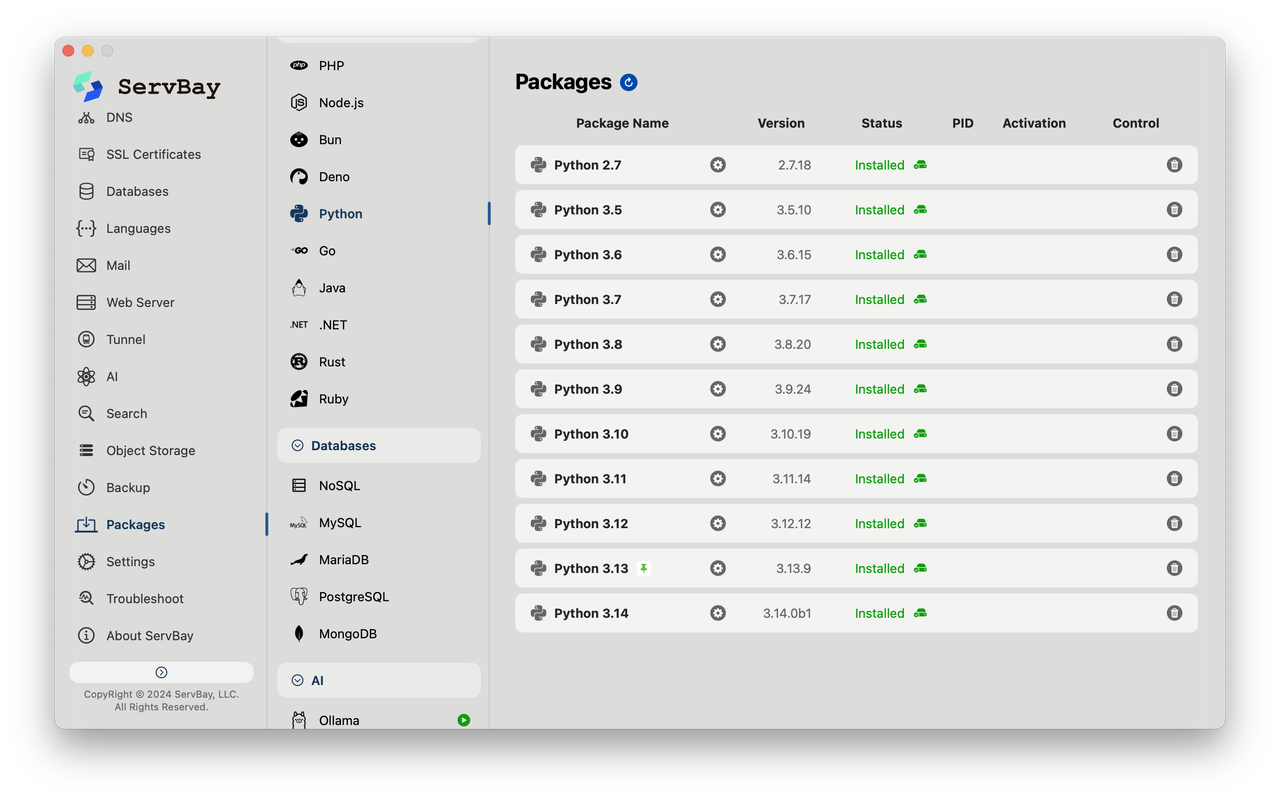 多版本共存:我手头有好几个项目,有的用 Python 3.11,有的老项目还停在 Python 2.7。ServBay 能让它们在我的电脑里和谐共存,我想在哪个项目上工作,就切换到哪个版本,非常方便。