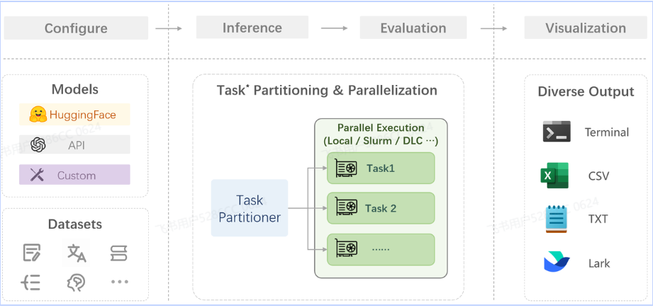 配置:这是整个工作流的起点。您需要配置整个评估过程,选择要评估的模型和数据集。此外,还可以选择评估策略、计算后端等,并定义显示结果的方式。