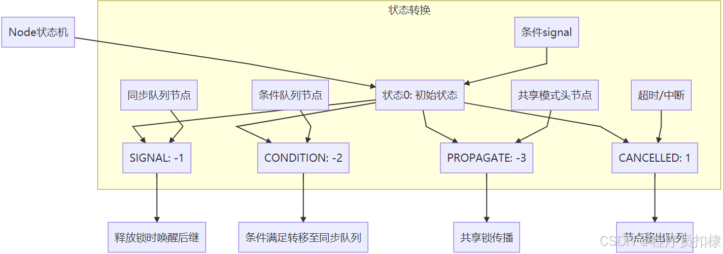 典型应用场景: 在doReleaseShared方法中,当头节点状态从SIGNAL变为0后,如果检测到有后续的共享节点,会将状态设置为PROPAGATE以确保传播继续。