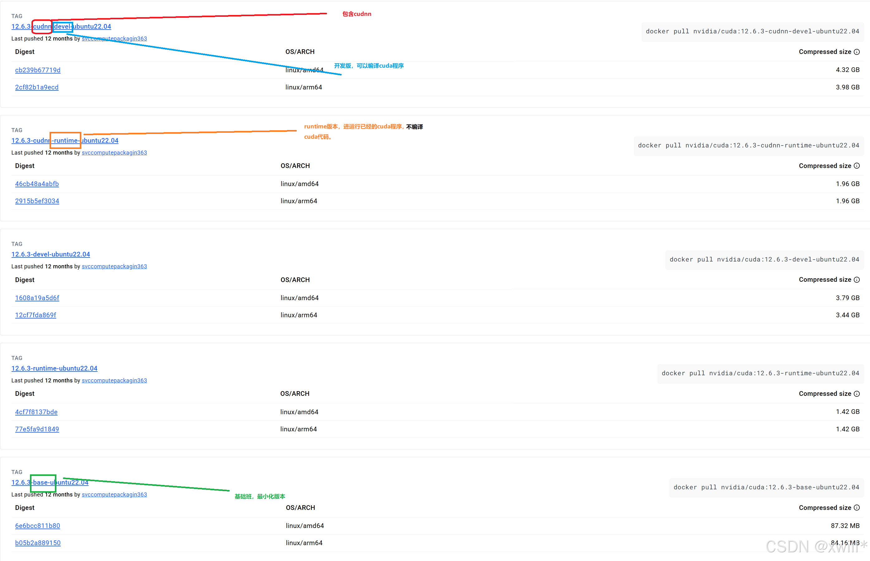 2 开始配置,我们从nvidia/cuda去选择并下载镜像,要注意镜像的版本比宿主机驱动默认支持的cuda版本要低。
